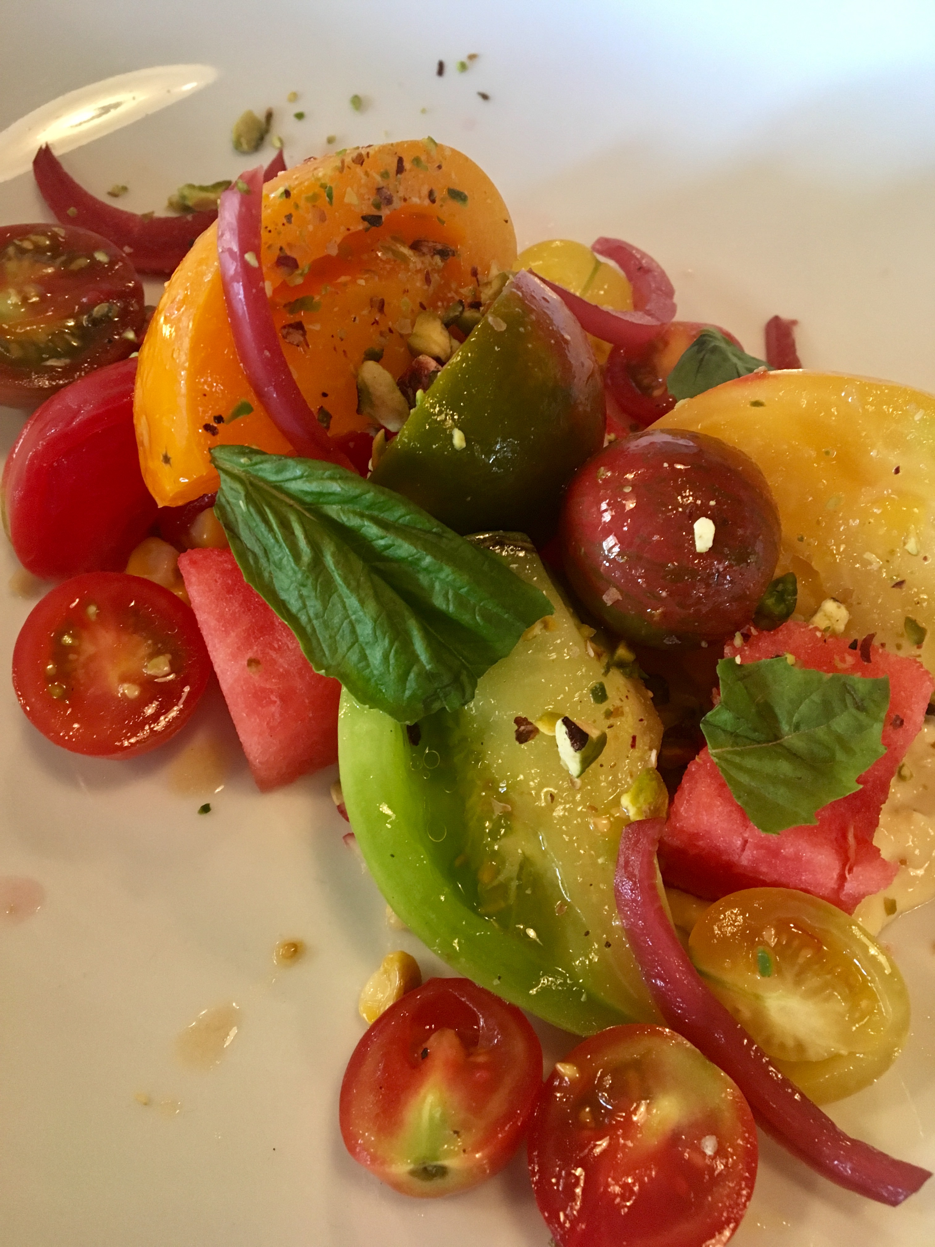 This is my kind of place! Mike and I shared an heirloom tomato salad with pickled red onions, watermelon and mint on a bed of fresh, local corn dressed with house-made corn crema. The pie we shared had fresh fennel, Gorgonzola, mozzarella, shaved fresh garlic, zucchini and mint. It was amazing!