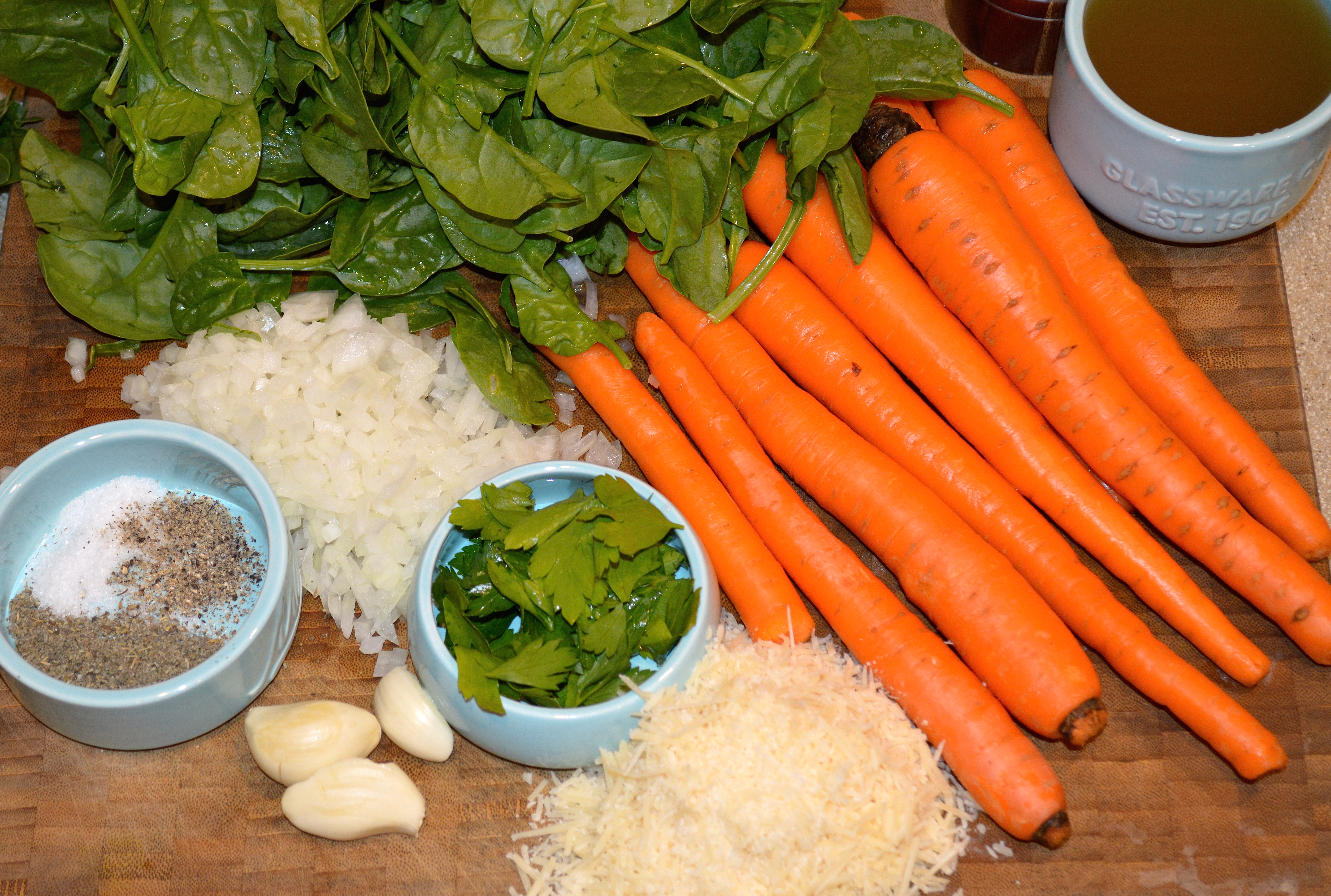Peel and chop 6-8 carrots, dice 1/2 an onion, dice 2 stalks celery and finely dice 2-3 cloves garlic. Gather 1 Tbsp fresh chopped parsley or 1 tsp dried and 1/2 tsp chopped fresh sage or 1/4 tsp dried.