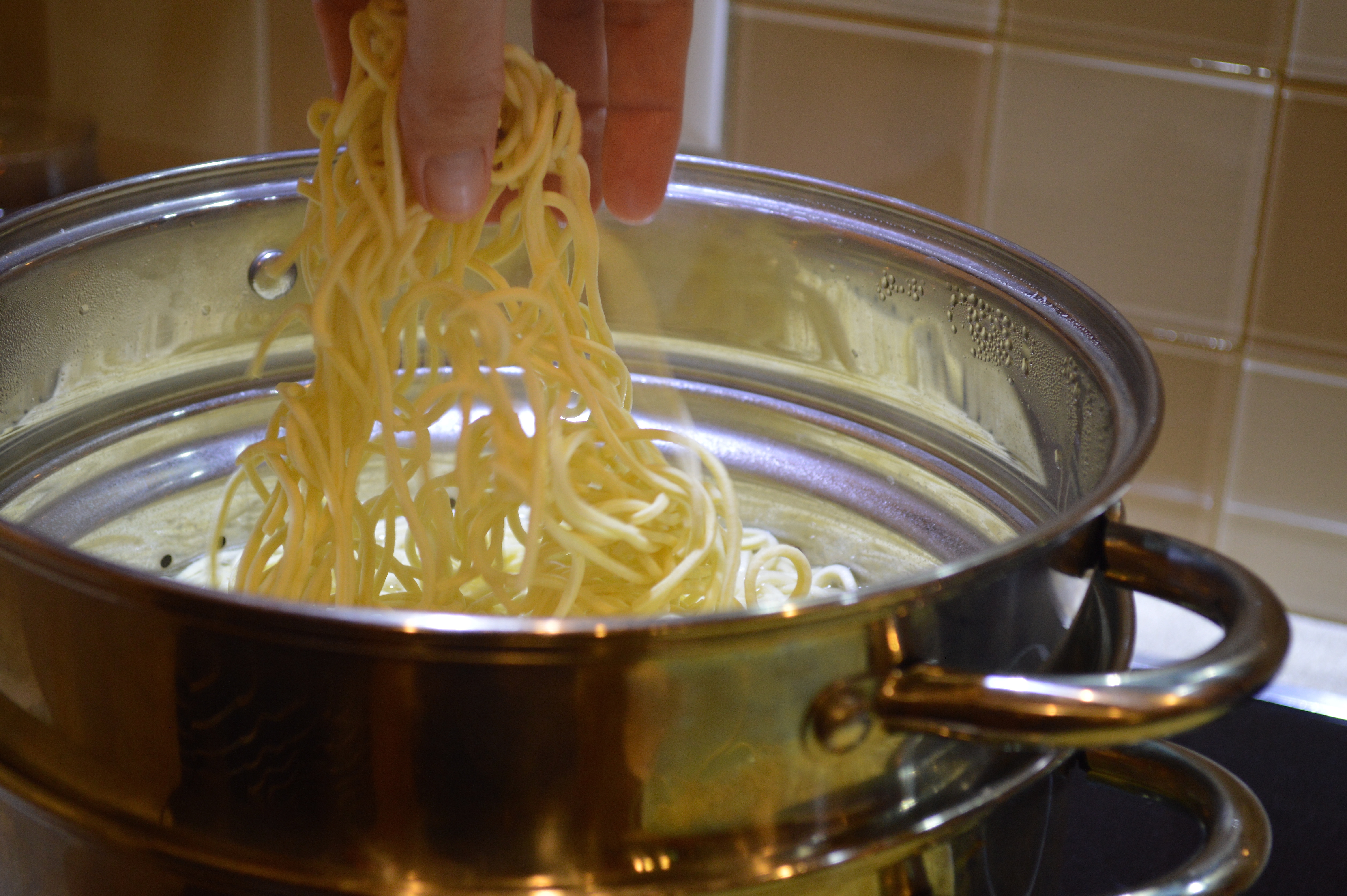 Rinse yellow noodles. Drain and set aside. Boil water, adding noodles once boiling and cook approximately 5-7 minutes. There wasn’t a cooking recommendation on the package so, check frequently so you don’t over cook them. Transfer noodles and drain well.