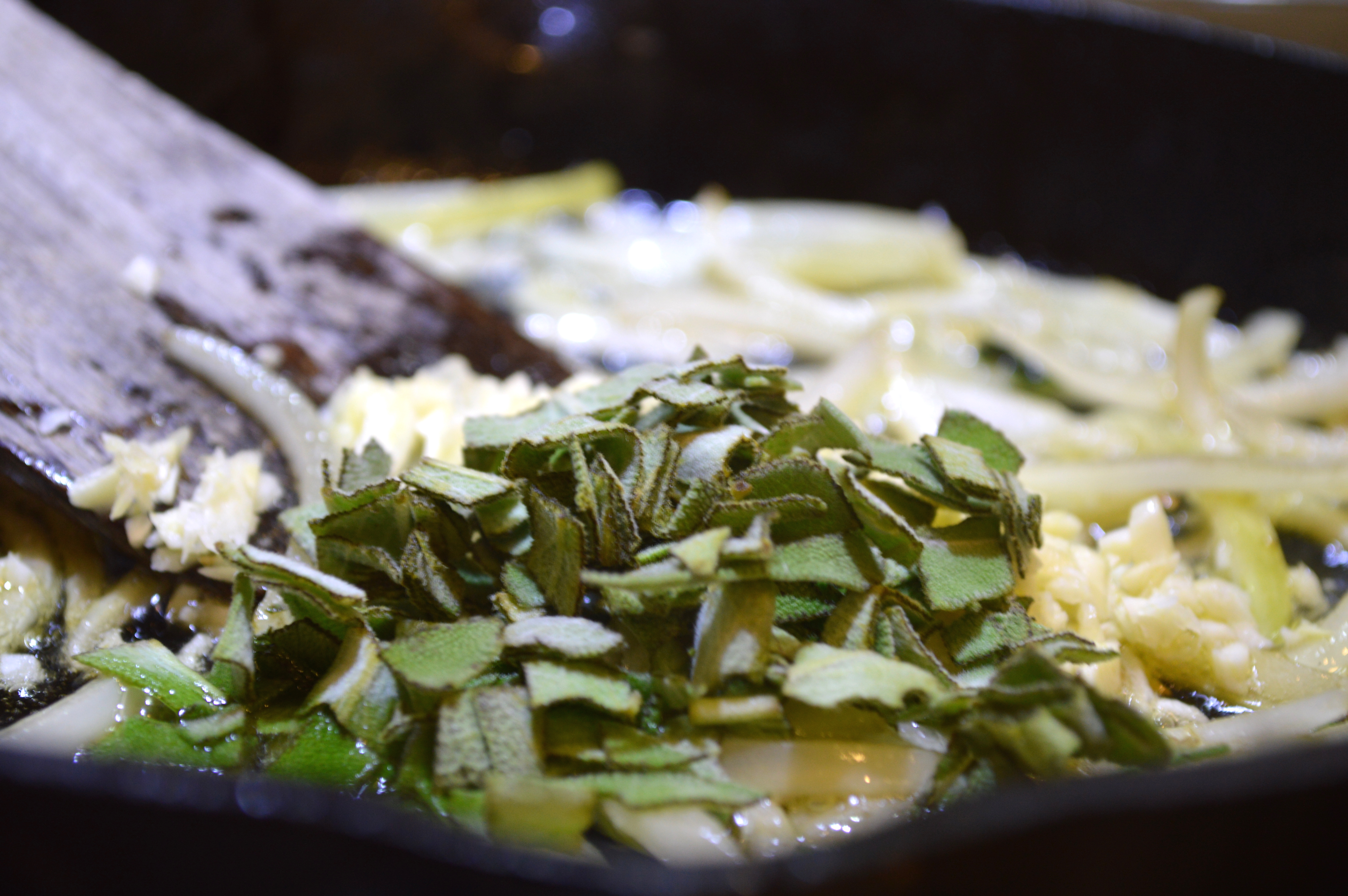 Preheat oven to 425°. Heat oil in skillet over med-high heat. Add onions, stirring occasionally, until beginning to brown, about 4 minutes. Reduce heat to med-low. Add garlic and sage to skillet and cook, stirring occasionally until garlic begins to brown slightly, about 2 minutes.